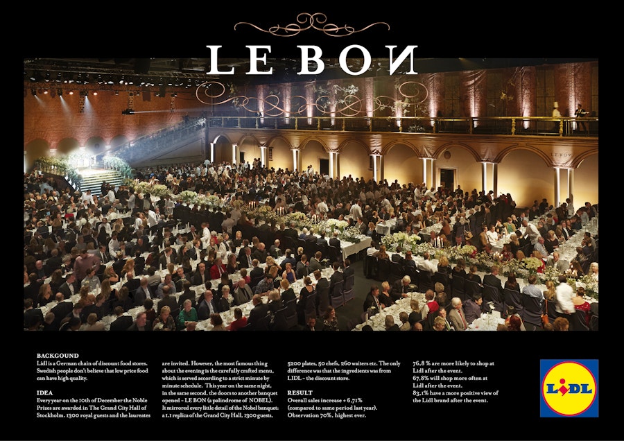 Lidl is a German chain of discount food stores. They have had a difficult time to become credible on the Swedish market. Swedish people don't believe that low price food can have high quality. The brief was to prove the quality of Lidls products and get more people curious to try them. We needed to create the ultimate proof that no one could disregard. We needed to challenge the food on an arena were only the very finest ingredients are excepted. And where the people would be the ones to judge it. Every year on the 10th of December the Noble Prizes are awarded in The Grand City Hall of Stockholm. 1300 royal guests and the laureates are invited. However, the most famous thing about the evening is the carefully crafted menu, which is served according to a strict minute by minute schedule. Millions of people watch the live broadcast in admiration over the banquet dinner. This year on the same night, in the same second, the doors to another banquet opened - LE BON (a palindrome of NOBEL). It mirrored every little detail of the Nobel banquet: a 1.1 replica of the Grand City Hall, 5200 plates, 50 chefs, 260 waiters etc. The only difference was that the 1300 guests were the people. Finally anyone could experience the Nobel menu - which was 100 % made of ingredients from LIDL, the discount store.